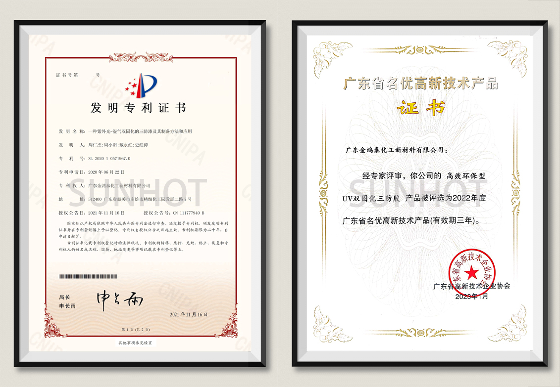本公司UV雙固化三防膠技術(shù)領(lǐng)先,制備方法獨特,已取得國家發(fā)明專(zhuān)利授權(專(zhuān)利號:ZL202010571967.0,一種紫外光-濕氣雙固化的三防漆及其制備方法和應用),并榮獲廣東省名優(yōu)高新技術(shù)產(chǎn)品稱(chēng)號。