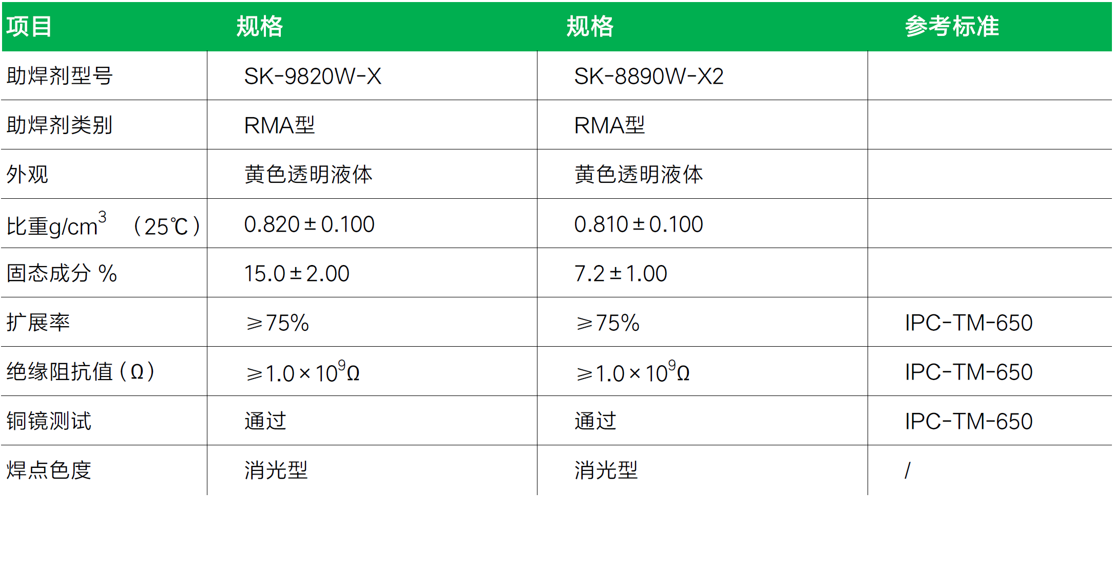 該助焊劑體系的活性經(jīng)過(guò)特別設計,其中,高固體含量及其內部活性機理不僅可保證電路板的板面在焊后形成均勻的保護膜,具有極高的表面絕緣性能,從而保證電路板電氣性能的可靠性;同時(shí),針對精密電子器件的焊接,我司該系列助焊劑可保證其極好的焊接性能,有效降低焊接不良率。在無(wú)特殊需求條件下,可免除清洗工序,進(jìn)而節約制造商的生產(chǎn)費用,有著(zhù)很大的可選擇工藝參數范圍,從而使之能適應于不同環(huán)境、不同設備及不同應用工藝。